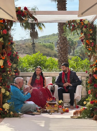 I officiate ceremonies using the traditional prayers in Sanskrit, the liturgical language of Hinduism, accompanied by translations and explanations in Spanish or English, according to the needs of the couple and guests. This ensures that the ceremony is accessible, understandable, and meaningful for everyone present. In addition, I speak Hindi and Italian fluently, which further facilitates connection with families from diverse cultural backgrounds.